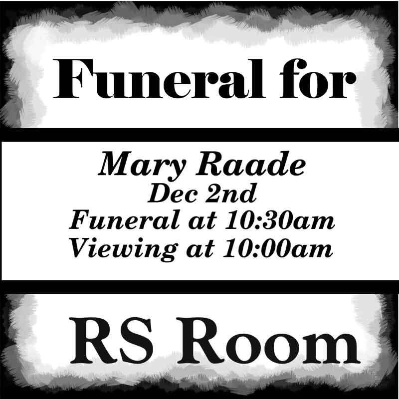 Mary Raade’s funeral will be held at the Clark Ave Building in the RS room at 10:30am.